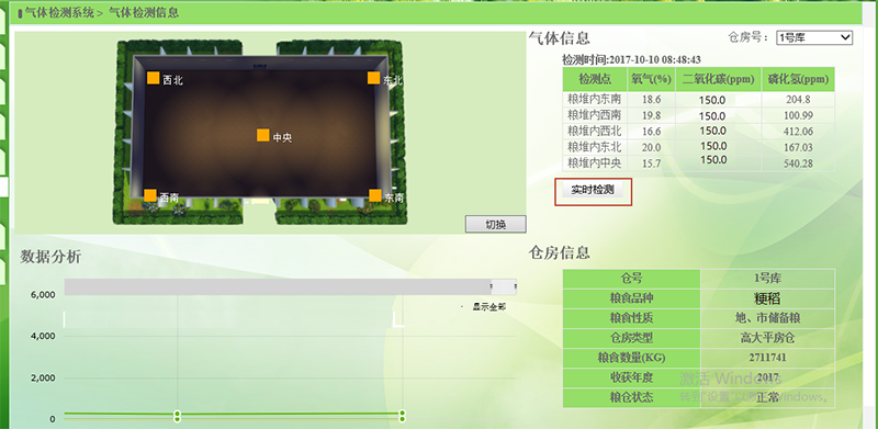該系統(tǒng)采用先進(jìn)的檢測和自控技術(shù),以智能分析控制系統(tǒng)為總指揮,以智能管理系統(tǒng)為核心,以氣體檢測儀為基礎(chǔ),控制系統(tǒng)通過前端設(shè)備的數(shù)據(jù)采集,在接收中央分析控制系統(tǒng)的指令的前提下,將數(shù)據(jù)傳回到中央分析控制系統(tǒng)。中央分析控制系統(tǒng)實(shí)現(xiàn)糧倉氣體濃度的全自動測量和數(shù)據(jù)處理,檢測氣體種類包括二氧化碳、氧氣、磷化氫氣體。